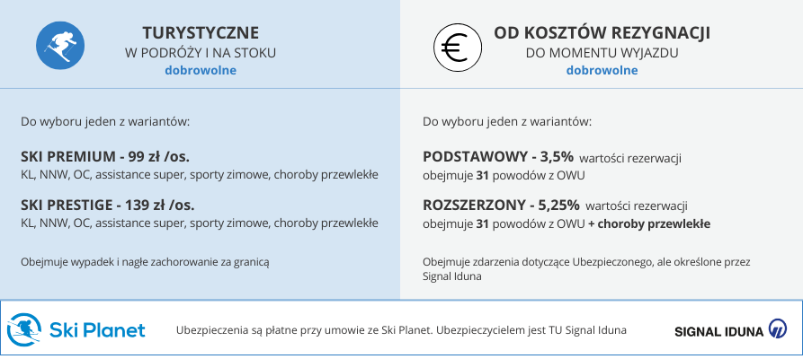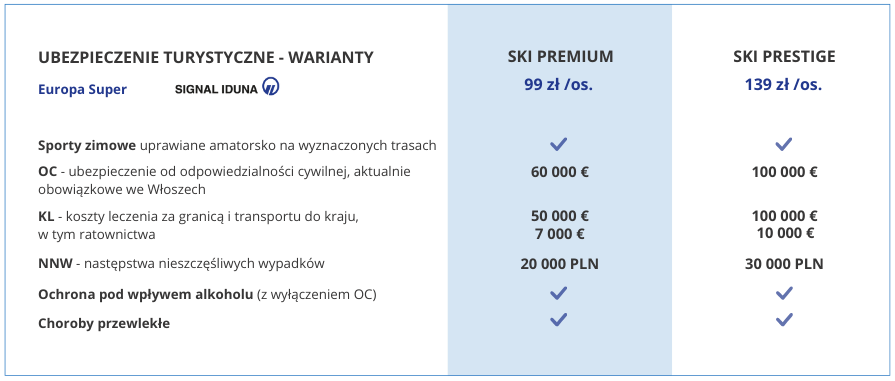 Do wyboru są dwa warianty: ubezpieczenie SKI PREMIUM (Europa Super SIGNAL IDUNA) lub SKI PRESTIGE (Europa Super SIGNAL IDUNA) o wyższych kwotach ubezpieczenia: